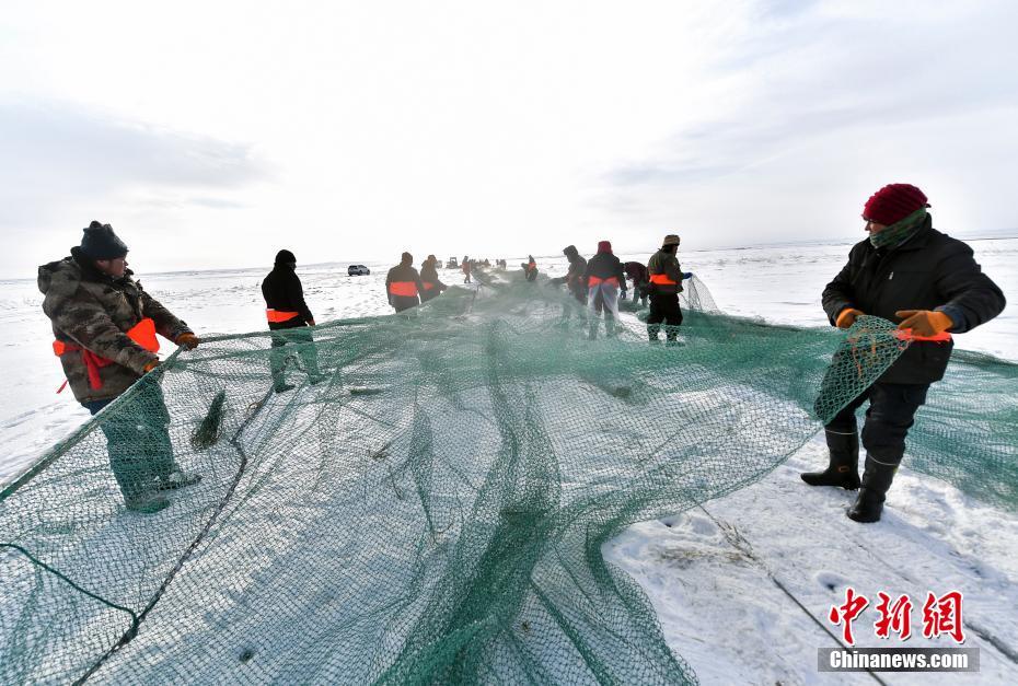 新疆乌伦古湖冬季冰上大拉网捕鱼启幕