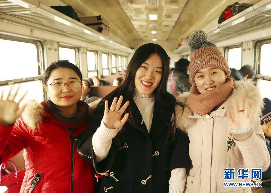 1月4日,三名乘客在太原开往石家庄北的6034次列车上留影。当日,由太原开往石家庄北的6034次“绿皮车”驶上它最后一次旅程。据悉,从1月5日零时起,全国铁路将实行新的旅客列车调整运行图,往返太原和石家庄北的6034/6033次列车将升级为空调客车。新华社发(张秀科 摄)