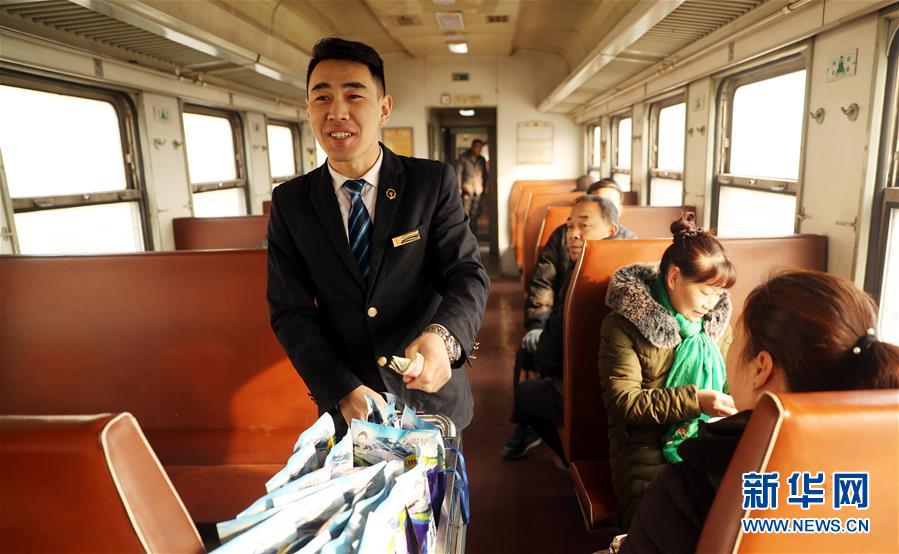 1月4日,在太原开往石家庄北的6034次列车上,列车员在售卖商品。当日,由太原开往石家庄北的6034次“绿皮车”驶上它最后一次旅程。据悉,从1月5日零时起,全国铁路将实行新的旅客列车调整运行图,往返太原和石家庄北的6034/6033次列车将升级为空调客车。新华社发(张秀科 摄)