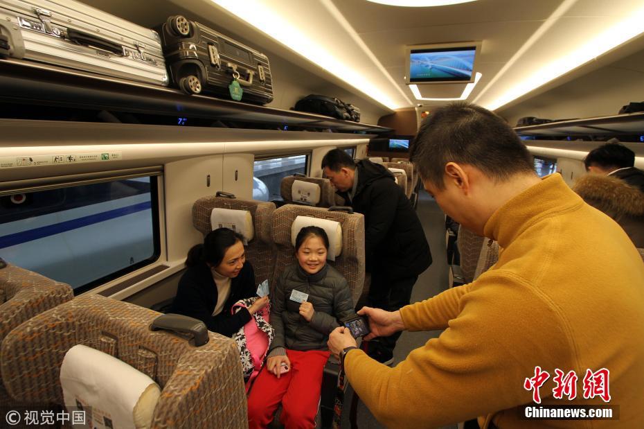 1月5日,17辆编组超长版时速350公里复兴号动车组列车首发亮相北京南站,执行京沪高铁北京南至上海虹桥的G9次列车。得知自己搭乘的是首发列车,乘客们开心的拍照留念。图片来源:视觉中国