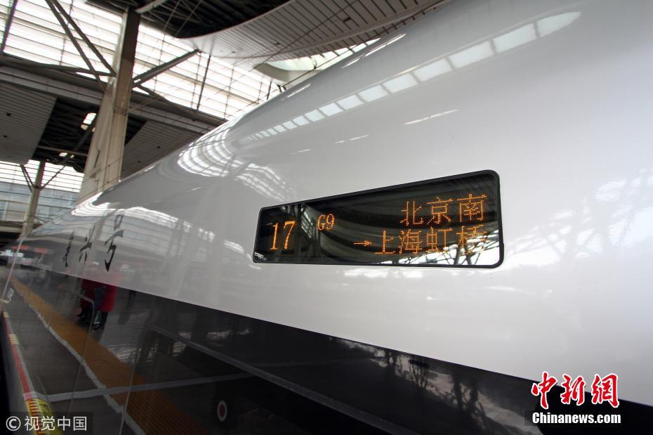 1月5日,铁路实行新的列车运行图时,超长版“复兴号”在京沪高铁上线运营,17辆编组超长版“复兴号”动车组将正式与旅客见面。据铁路部门介绍,超长版“复兴号”动车组全长439.9米,载客定员1283人,载客能力较16辆编组提升了7.5%。图为1月5日,北京南站站台上整装待发的CR400AF-B-2116复兴号动车组。图片来源:视觉中国