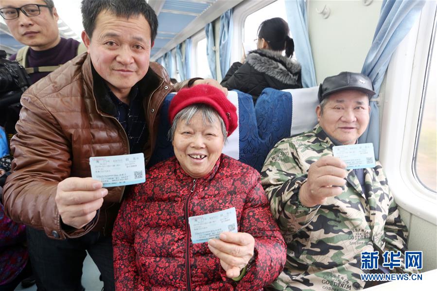 1月5日,海门居民何建超(前左一)带着从未坐过火车的父母乘坐首发列车。 当日,宁启铁路南通至启东段正式开通。宁启铁路位于江苏省中部,西起南京,东至启东。 新华社发(许丛军 摄)