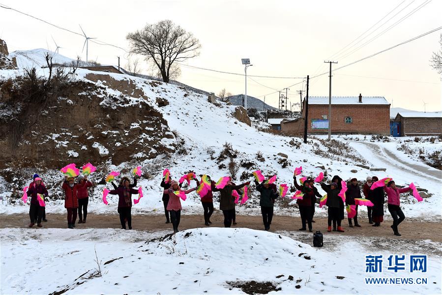 1月2日,在山西省浑源县山阴山村,浑源县贫困山区合唱团团员和村民们一起扭秧歌。 新华社记者 詹彦 摄