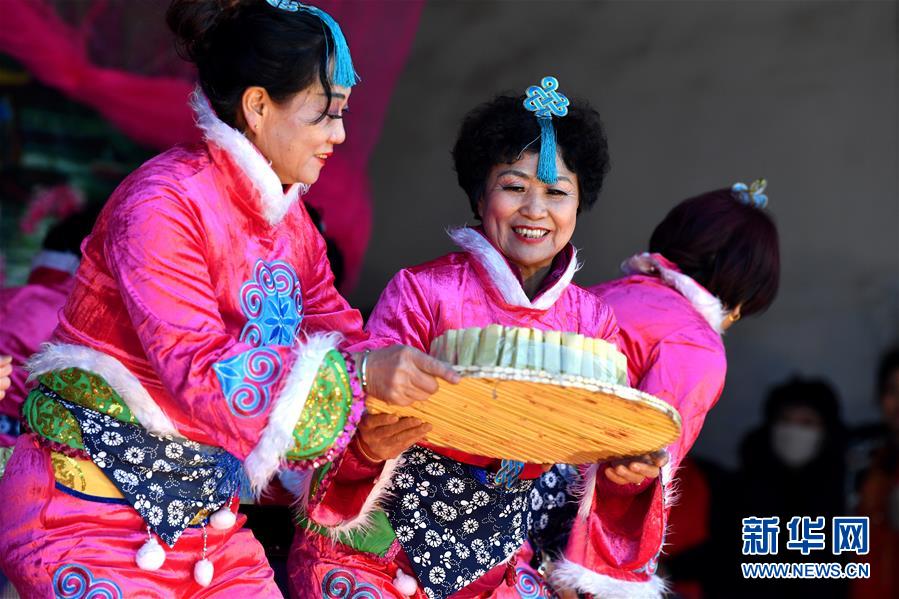 1月3日,在山西省浑源县荆庄村,浑源县贫困山区合唱团在表演舞蹈《蒸莜面》。 新华社记者 詹彦 摄