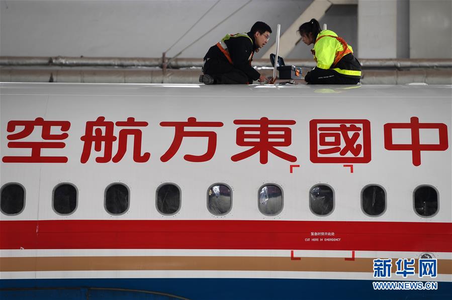 1月4日,在东航技术甘肃分公司机库,杨佳郁(右)和师父杨杰男在飞机顶部安装天线组件。 新华社记者 范培珅 摄