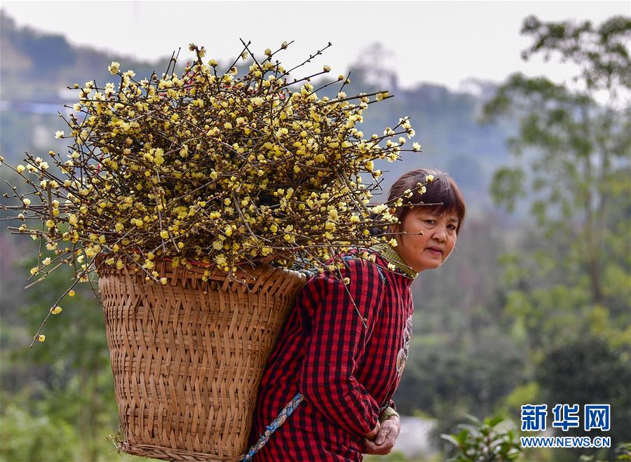1月5日,在重庆市北碚区静观镇万全村,村民背着装满腊梅花的背篓向村口的小集市走去。 新华社记者 刘潺 摄