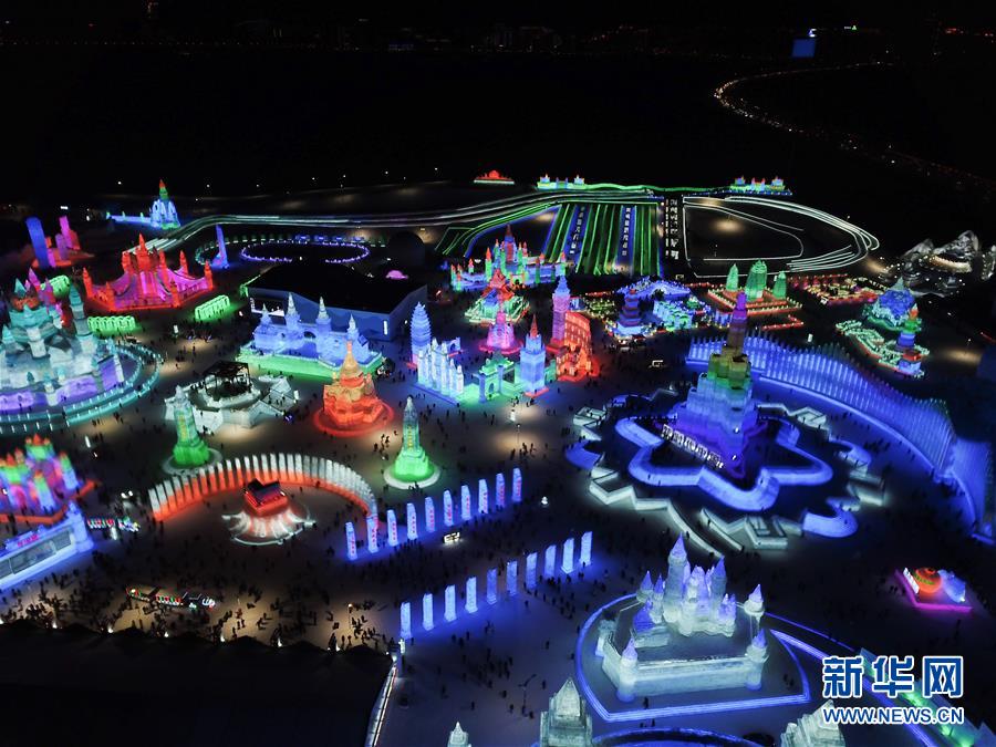 1月5日无人机拍摄的第35届中国·哈尔滨国际冰雪节主会场之一哈尔滨冰雪大世界园区。 新华社记者 王松 摄