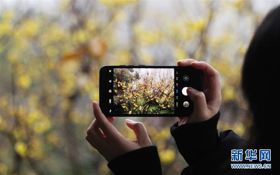 1月5日,游人在扬州瘦西湖风景区拍摄腊梅。
