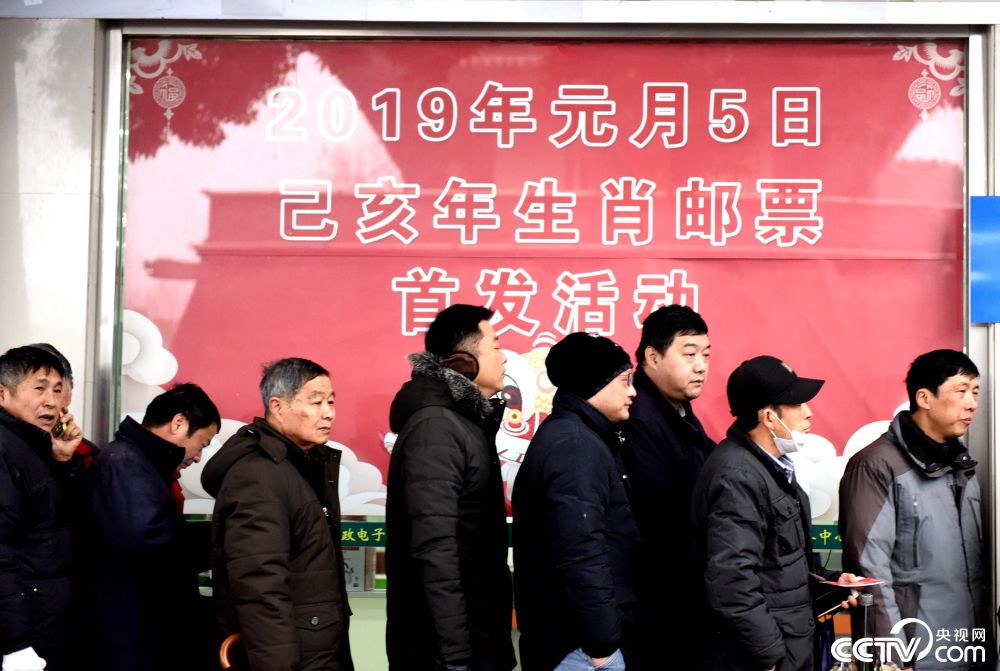 央视网消息:1月5日,中国邮政发行《己亥年》特种邮票1套2枚。第四轮生肖邮票通过深挖文化理念,以“家”的核心概念,将生肖的形象特点与中国人的家国情怀巧妙结合,赋予生肖形象以“合家欢”的生动设定。图为江苏省仪征市中心鼓楼广场邮政支局集邮柜台,热情的市民和集邮爱好者正在排队等候购买2019 年猪年《己亥年》生肖特种邮票。视觉中国