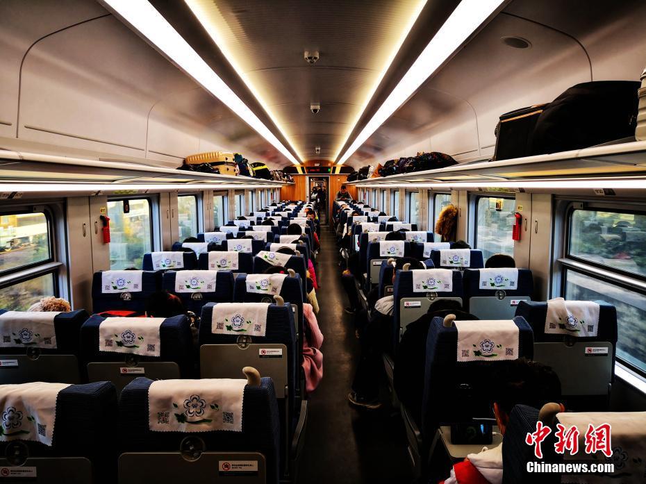 1月5日,时速160公里的CR200J型复兴号动车组满载旅客从云南昆明始发,一路向南奔跑,2小时43分后抵达红河州蒙自市,这是中国铁路160公里时速复兴号在云南的首秀,也是昆明至蒙自首次开行动车组列车。开行初期,昆明至蒙自每天开行3对,高峰期再增开2对,运行时间最短2小时43分、最长3小时09分。图为旅客乘坐在复兴号动车宽敞明亮的车厢里。中国铁路昆明局集团有限公司 供图