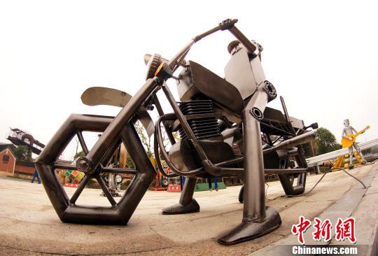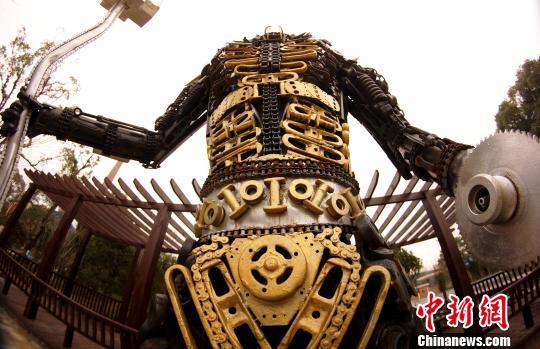 工人利用废钢等物资制作了多个“变形金刚”,最大的近4米高,重达两吨。 王昊阳 摄