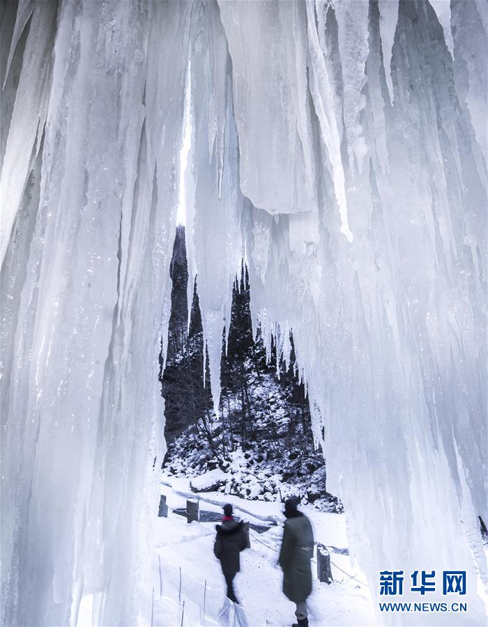 游人在吉林省长白县十五道沟望天鹅景区内观赏冰瀑景观(1月3日摄)。新华社记者张楠摄