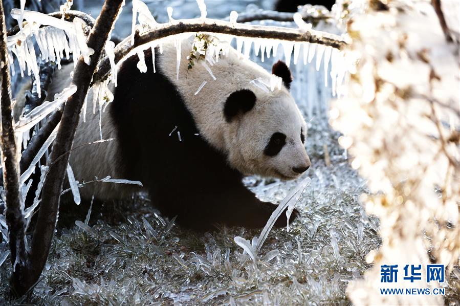 1月6日,大熊猫娅双在园区内玩耍。 严冬时节,正当人们裹得严严实实的时候,济南野生动物世界的大熊猫却格外欢实。园区工作人员特意准备了树挂景观,提高观赏度的同时,也让大熊猫在冰天雪地里尽情“撒欢”。 新华社记者王凯摄