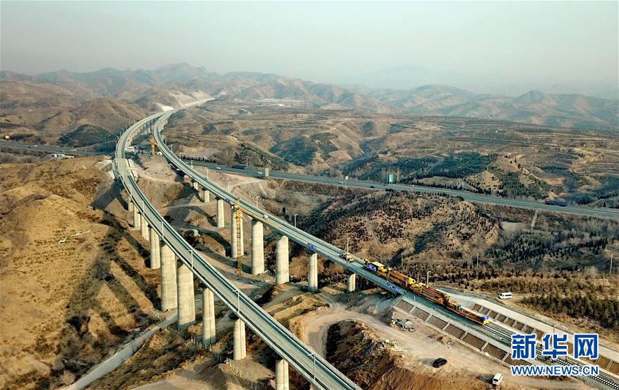 1月6日,工人在崇礼铁路张家口市下花园区戴家营大桥铺轨现场工作(无人机拍摄)。新华社记者杨世尧摄