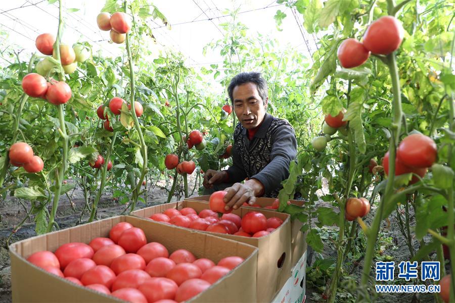 1月6日,唐山市丰润区丰润镇圪塔坨村农民在大棚内采摘西红柿。