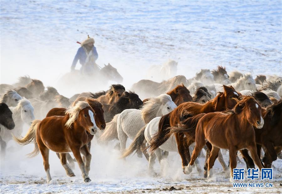 1月6日,内蒙古赤峰市克什克腾旗的牧民在雪原上驯马。新华社记者彭源摄