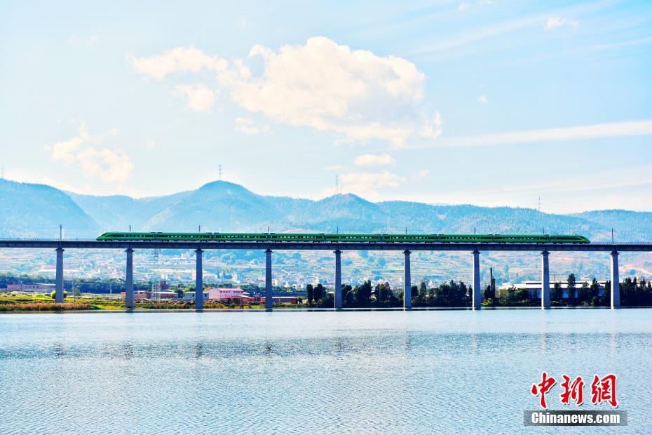 1月5日,时速160公里的CR200J型复兴号动车组满载旅客从云南昆明始发,一路向南奔跑,2小时43分后抵达红河州蒙自市,这是中国铁路160公里时速复兴号在云南的首秀,也是昆明至蒙自首次开行动车组列车。开行初期,昆明至蒙自每天开行3对,高峰期再增开2对,运行时间最短2小时43分、最长3小时09分。图为复兴号驰骋在云南省红河哈尼族彝族自治州鸡街大桥上。中国铁路昆明局集团有限公司 供图