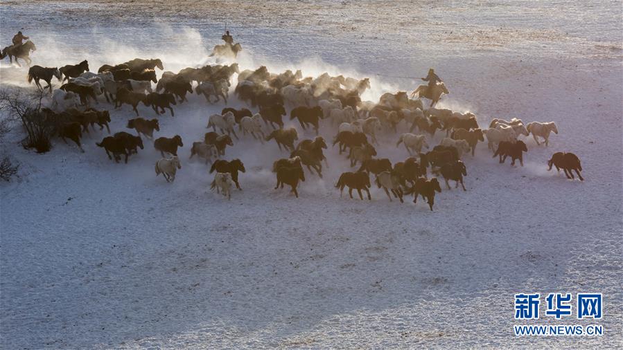 1月6日,内蒙古赤峰市克什克腾旗乌兰布统苏木牧民正在赶着马群为游客表演。新华社发(孙国树 摄)