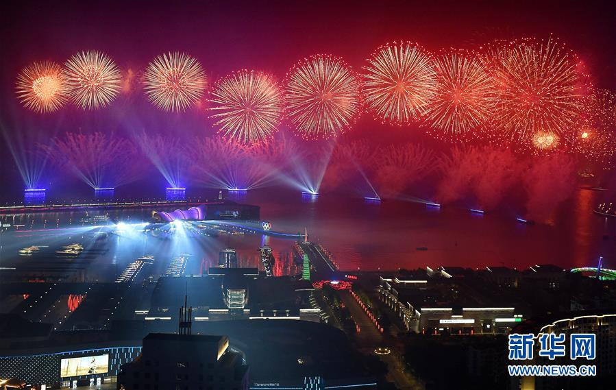 这是上合组织青岛峰会期间举行的《有朋自远方来》灯光焰火艺术表演(2018年6月9日摄)。 新华社记者 李紫恒 摄