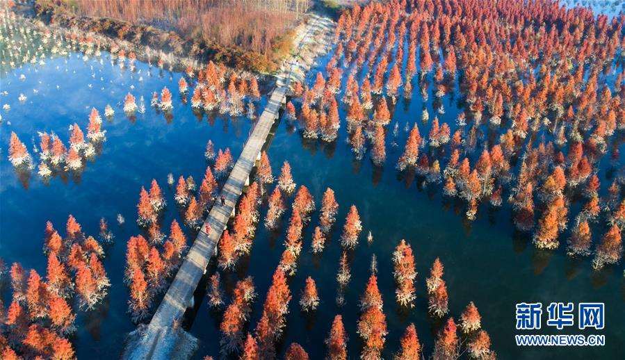 游人在甸尾村水杉湿地游玩(1月5日无人机拍摄)。 新华社记者 秦晴 摄