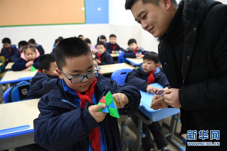 1月7日,合肥市朝霞小学“课后三点半”魔方特色课老师在指导孩子玩魔方。新华社记者刘军喜摄