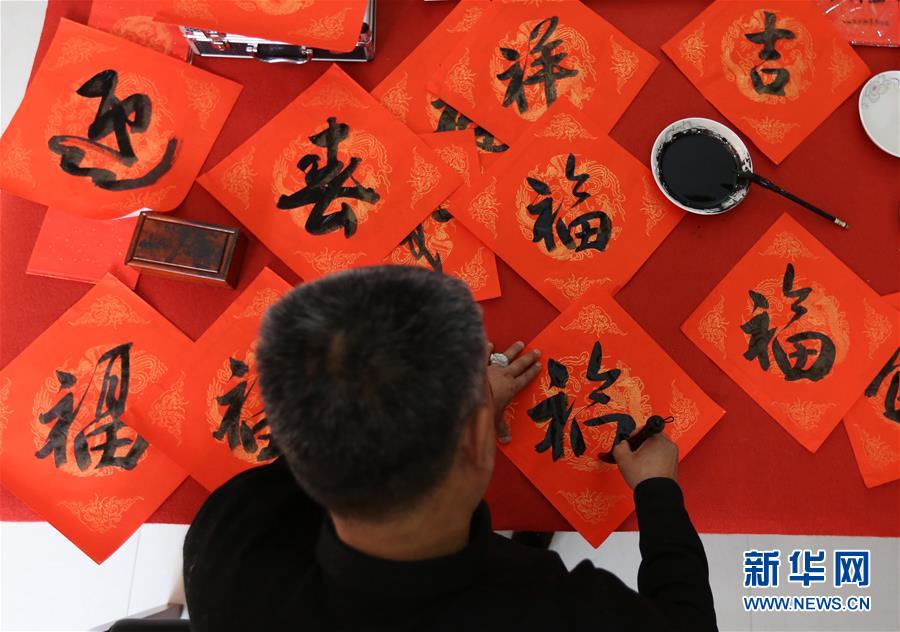 1月7日,书画爱好者在固安县林城村为村民写福字。