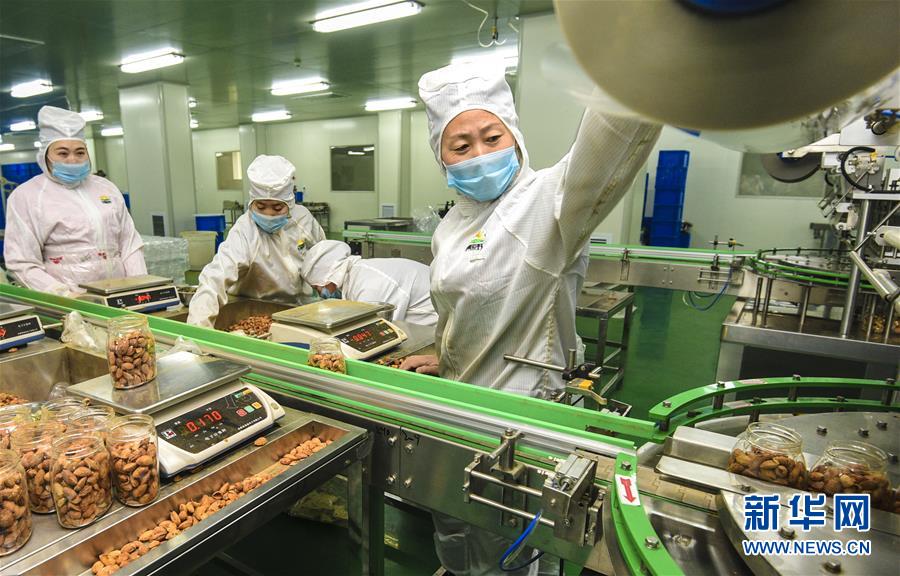 1月8日,在河北霸州都市食品产业园一家干果生产企业,工人包装干果产品。新华社记者 李晓果 摄