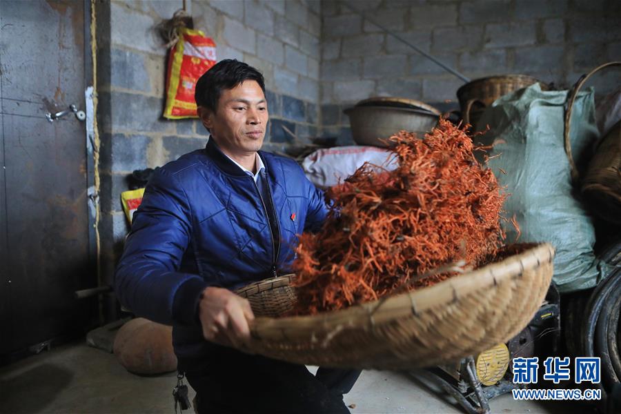 1月8日,付堂径在筛选红根野蚕豆的根部。 41岁的付堂径是贵州省黔南布依族苗族自治州罗甸县红水河镇胡家湾村村民,2014年开始自发研究种植特色药材红根野蚕豆,经过几年努力,他将药材种植面积扩大到现在的12亩。付堂径已于2018年主动脱贫,同时带动当地49户208名贫困户参与种植。 新华社记者欧东衢摄
