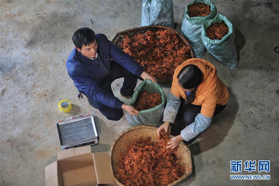 1月8日,付堂径(左)与妻子在整理红根野蚕豆的根部。 41岁的付堂径是贵州省黔南布依族苗族自治州罗甸县红水河镇胡家湾村村民,2014年开始自发研究种植特色药材红根野蚕豆,经过几年努力,他将药材种植面积扩大到现在的12亩。付堂径已于2018年主动脱贫,同时带动当地49户208名贫困户参与种植。 新华社记者欧东衢摄