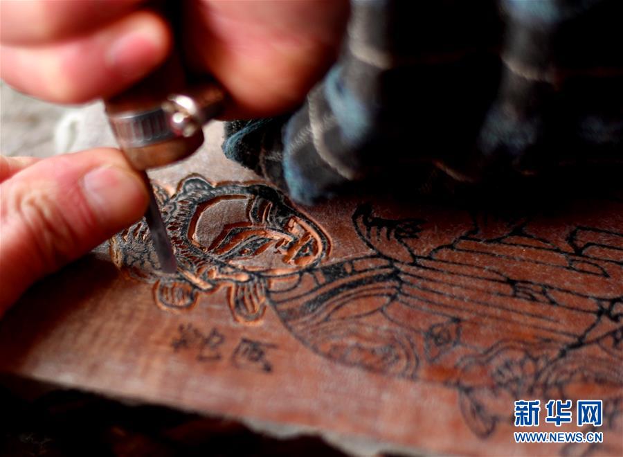 1月8日,开封市朱仙镇的年画艺人在雕刻印刷年画的木板。 新华社记者李嘉南摄