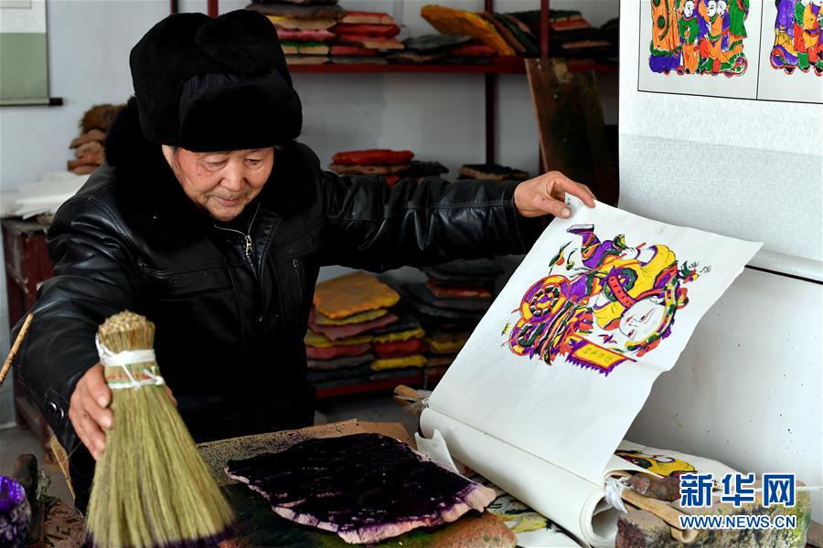 1月8日,开封市朱仙镇的年画艺人在印制木版年画。 新华社记者李嘉南摄