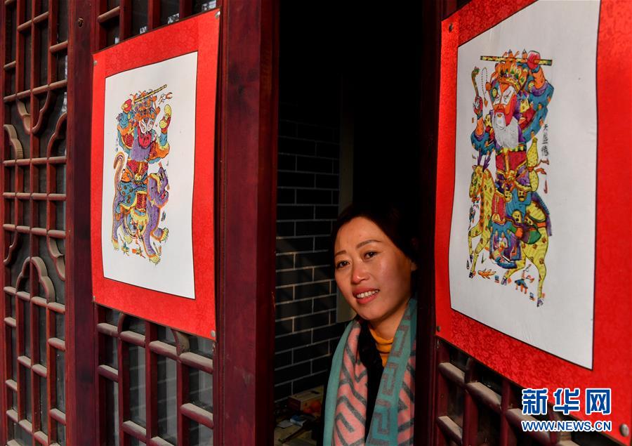 1月8日,在开封市朱仙镇,一位游客打开贴有木版年画的门。 新华社记者李嘉南摄