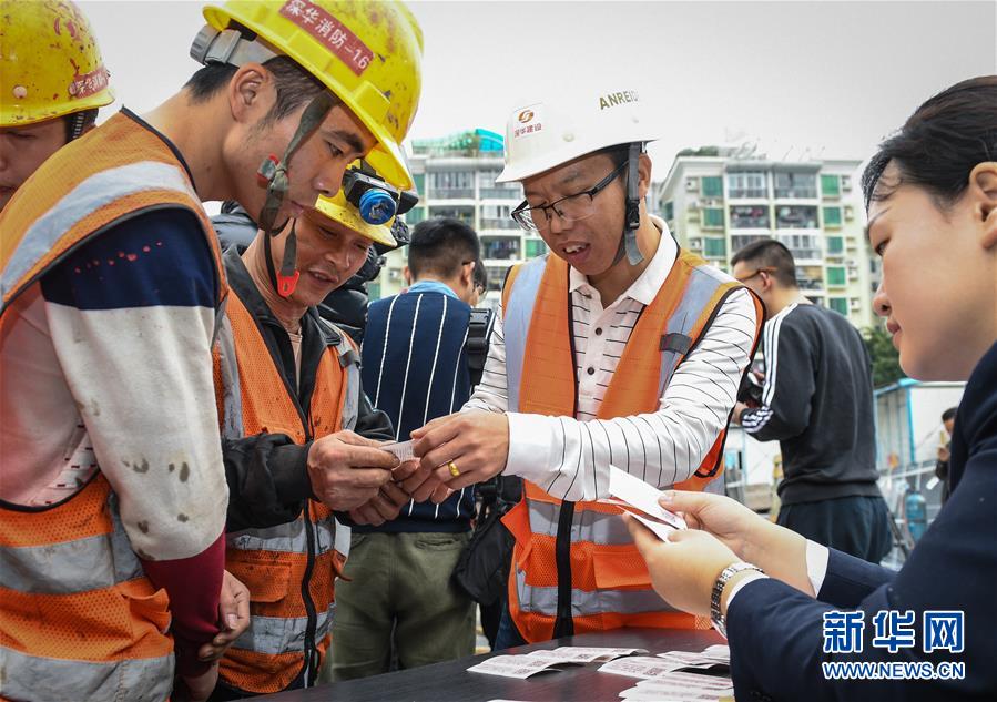 1月8日,在汉京金融中心建设工地上,外来工领取春运火车票。 当日,深圳火车站在深圳南山科技园片区汉京金融中心建设工地开展“送票进工地”活动。 新华社记者 毛思倩 摄