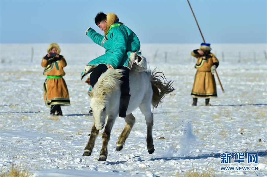 1月8日,牧民在驯服一匹烈马。 时下正值草原冬季旅游旺季,内蒙古自治区西乌珠穆沁旗的牧民们在雪原上一展身手,为游客展现独特的民族风情。 新华社记者 邹予 摄