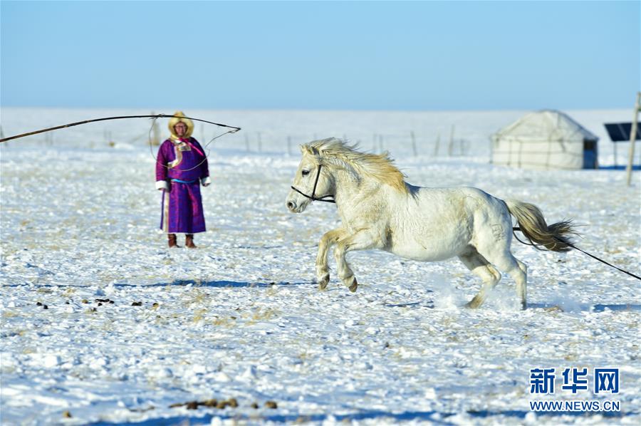 1月8日,牧民进行套马表演。 时下正值草原冬季旅游旺季,内蒙古自治区西乌珠穆沁旗的牧民们在雪原上一展身手,为游客展现独特的民族风情。 新华社记者 邹予 摄