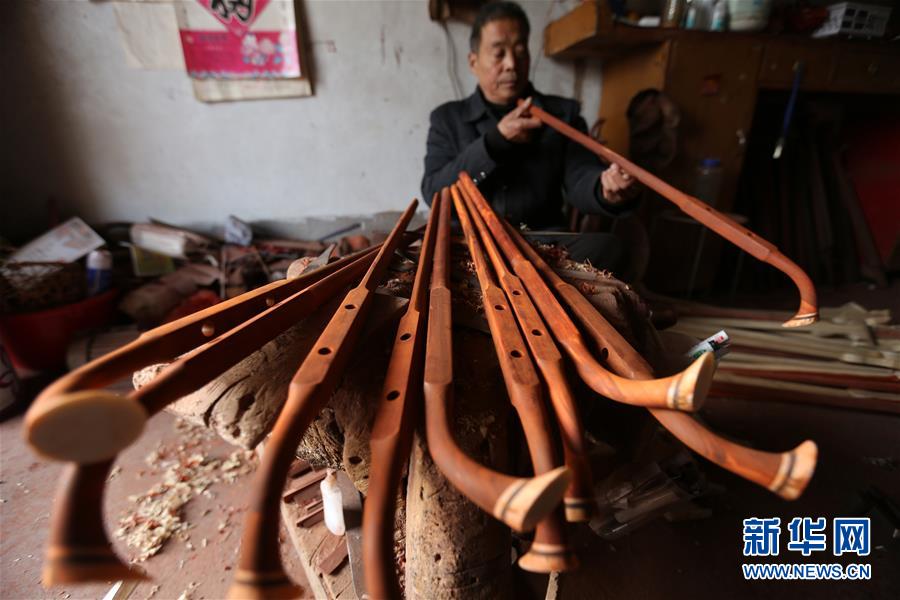 1月8日,乐泉村村民高振保在查看二胡琴杆质量。 山东省临沂市郯城县庙山镇乐泉村手工二胡制作历史悠久。二胡结构简单,实则制作难度很大,需要切割、打磨、凿、雕、刻等多道工序,每一道工序都决定着乐器的质量。乐泉村全村有90多户村民常年从事二胡、京胡等民族乐器制作,产品销往全国各地。 新华社发(张春雷 摄)