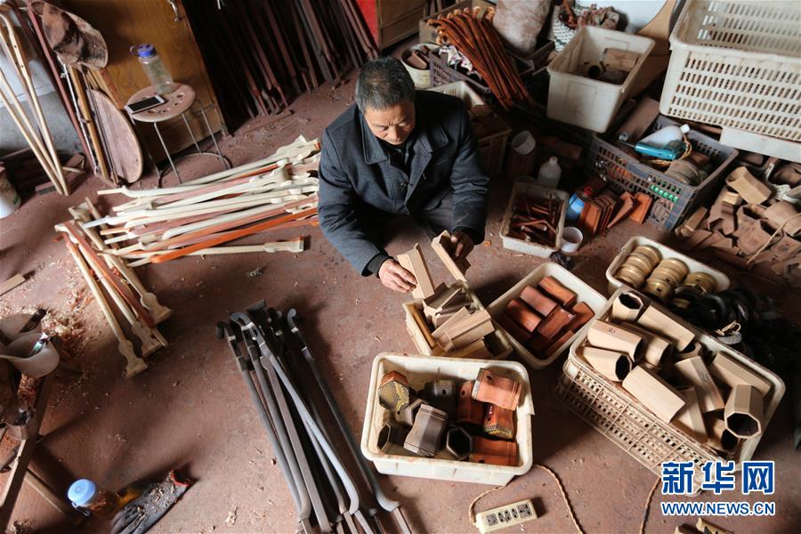 1月8日,乐泉村村民高振保在查看制作二胡的配件材料。 山东省临沂市郯城县庙山镇乐泉村手工二胡制作历史悠久。二胡结构简单,实则制作难度很大,需要切割、打磨、凿、雕、刻等多道工序,每一道工序都决定着乐器的质量。乐泉村全村有90多户村民常年从事二胡、京胡等民族乐器制作,产品销往全国各地。 新华社发(张春雷 摄)