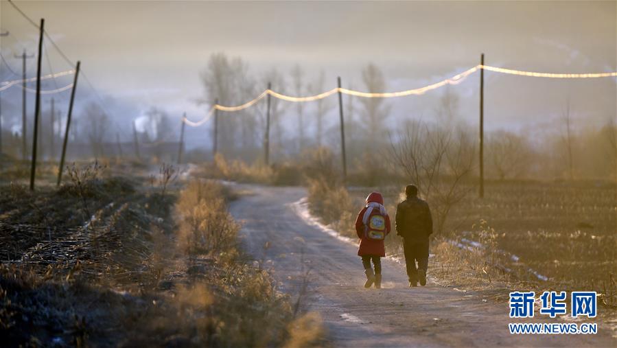 一大早,扈志生老师和孙晓峰冒着严寒,迎着朝阳,走在上学的路上,这段20多分钟的山路,成为师生二人往返学校必经的行程(1月8日摄)。新华社记者 姚剑锋 摄