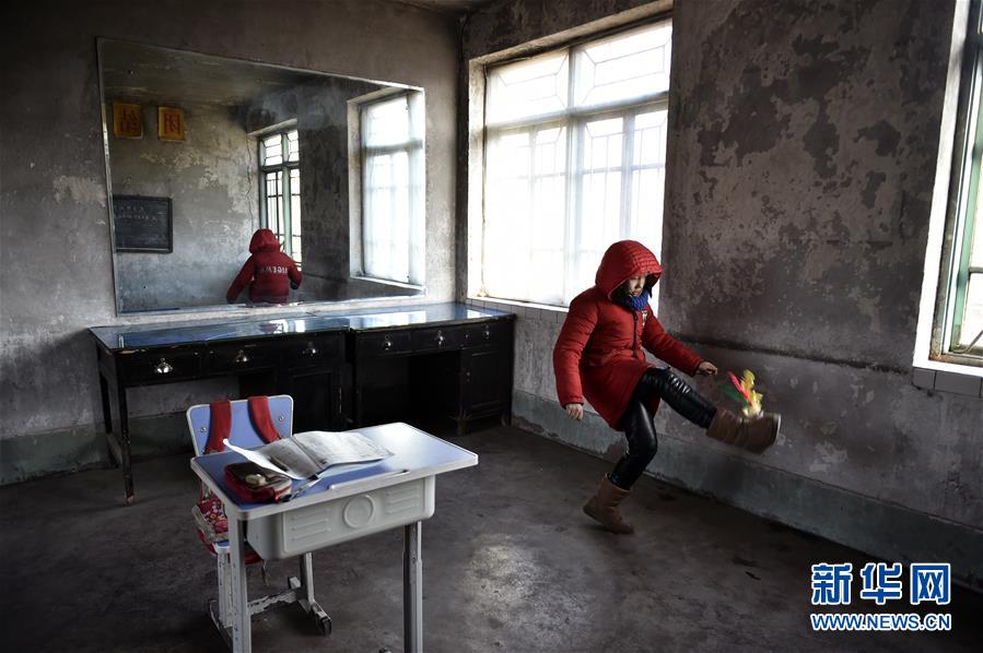 孙晓峰课间的时候,在教室里踢毽球,教室外面温度达到了零下十几度(1月7日摄)。新华社记者 姚剑锋 摄