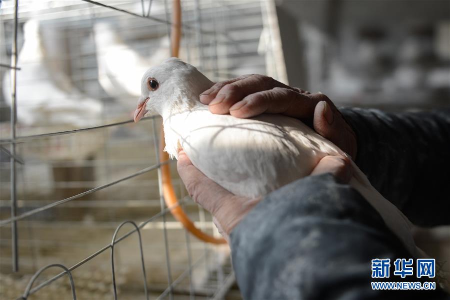 喀什市英吾斯塘乡英乃喀什村村民图提古丽·达伍提将种鸽放入鸽笼(1月7日摄)。 新华社发(丁磊 摄)