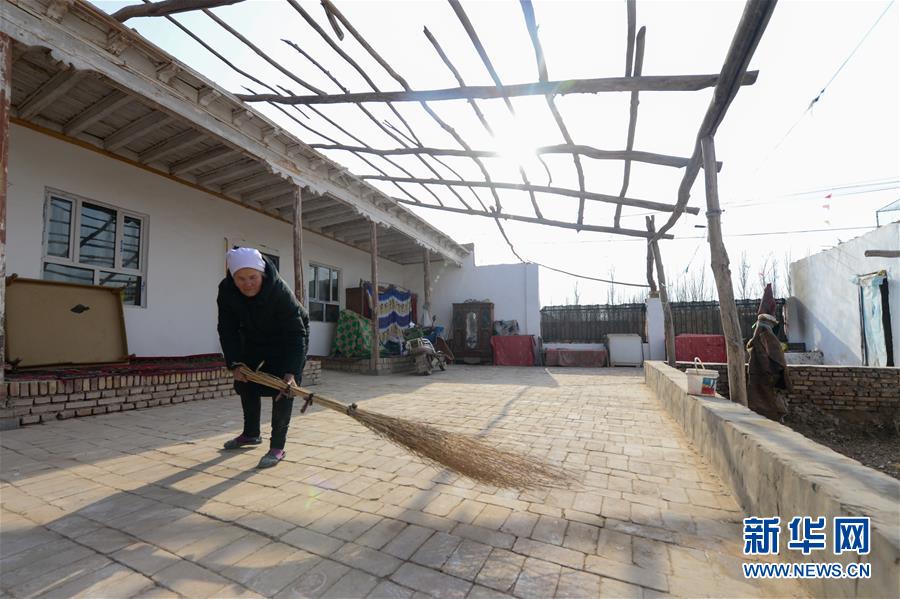 喂完鸽子,喀什市英吾斯塘乡英乃喀什村村民图提古丽·达伍提在富民安居房院内打扫卫生(1月7日摄)。 新华社发(丁磊 摄)