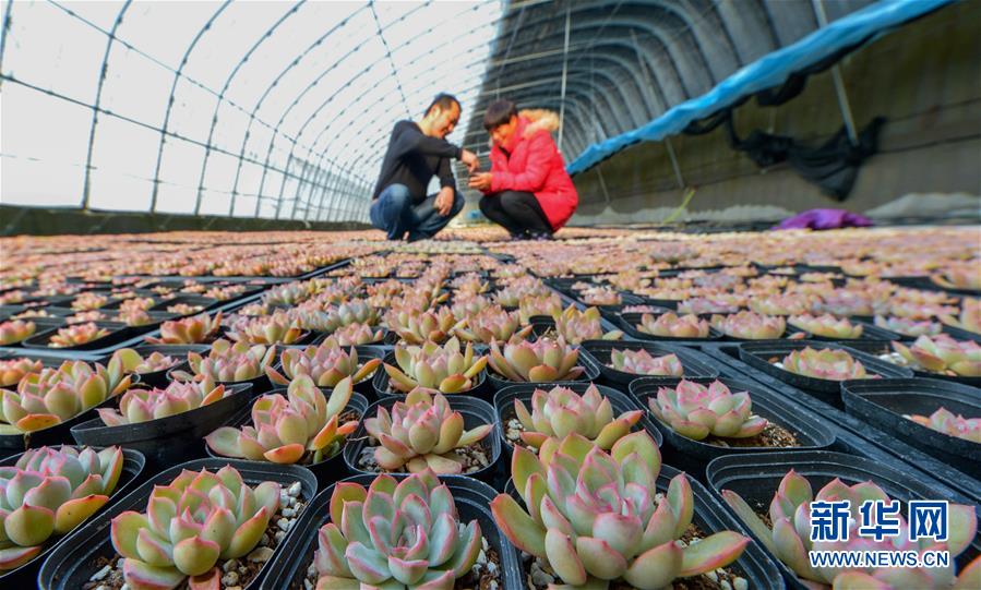 1月9日,在涉县固新镇连泉多肉植物种植基地,农民查看多肉植物的长势。新华社记者 王晓 摄