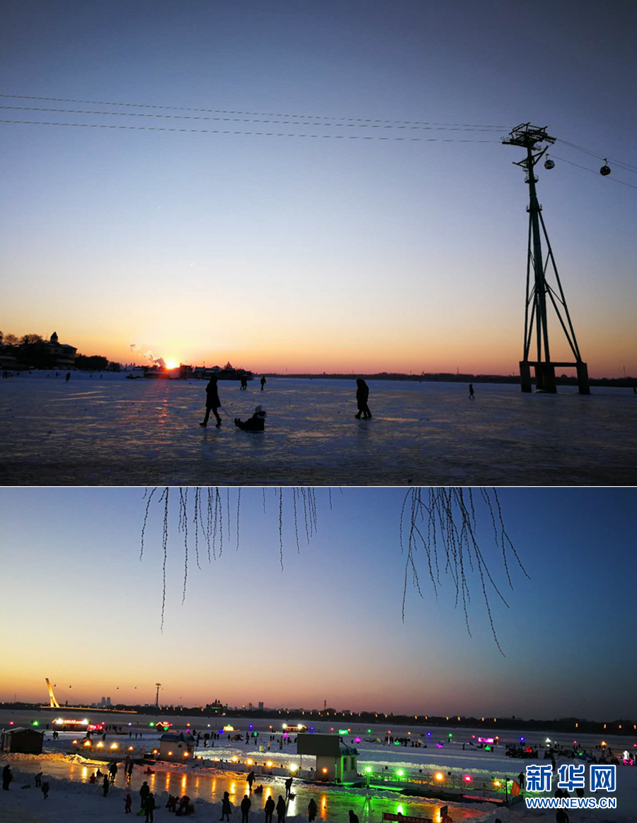 1月5日,黄昏时分的松花江面热闹非凡。 新华网记者 张明宇 摄