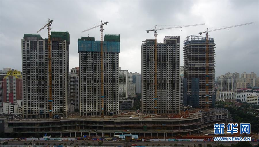 海口市金贸东路上正在施工的楼盘(1月9日无人机拍摄)。 新华社记者 杨冠宇 摄
