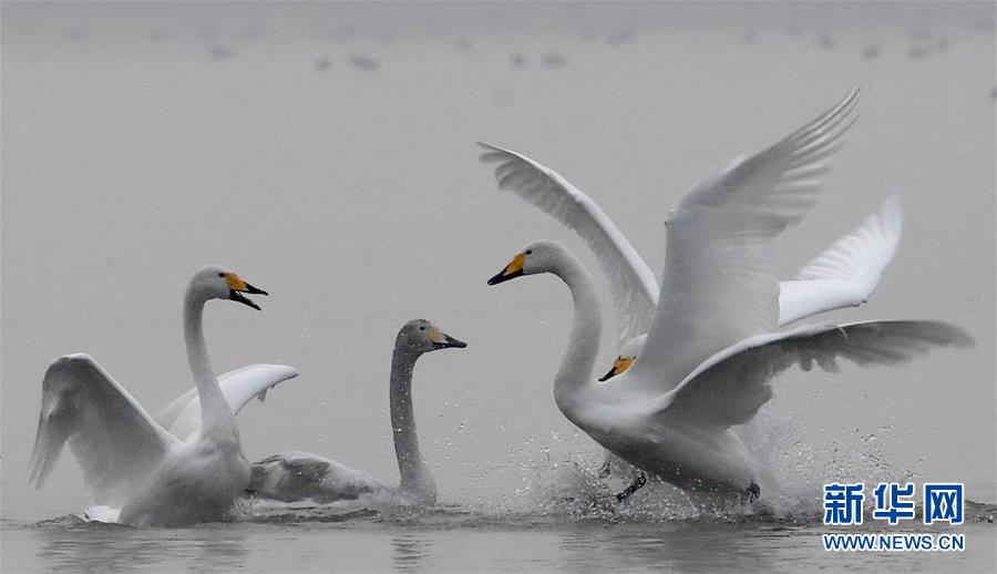 白天鹅在三门峡黄河湿地栖息(2017年12月3日摄)。 新华社记者 朱祥 摄