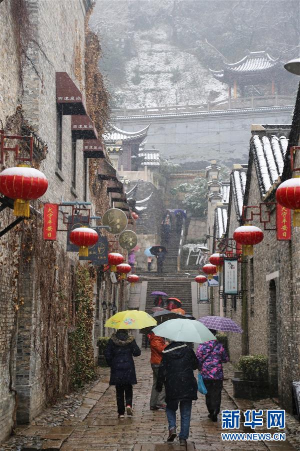1月9日,游客在雪中游览江苏省镇江市西津渡古街。当日,我国多地迎来降雪天气。 新华社发(孙晨飞 摄)