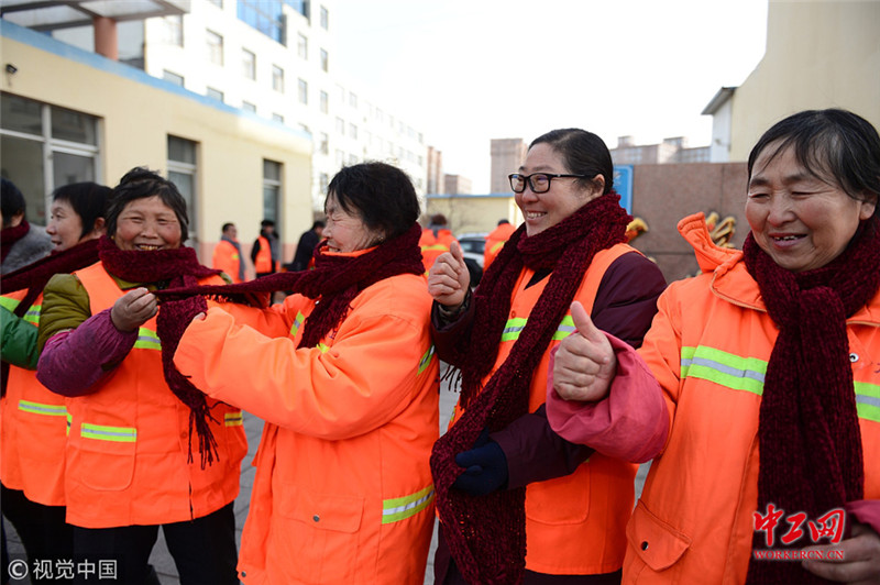 2019年1月9日,山东威海荣成市石岛管理区的爱心自愿者将手工织好的234条围脖戴在街头劳动、眼含泪花的环卫工人身上。杨志礼/视觉中国