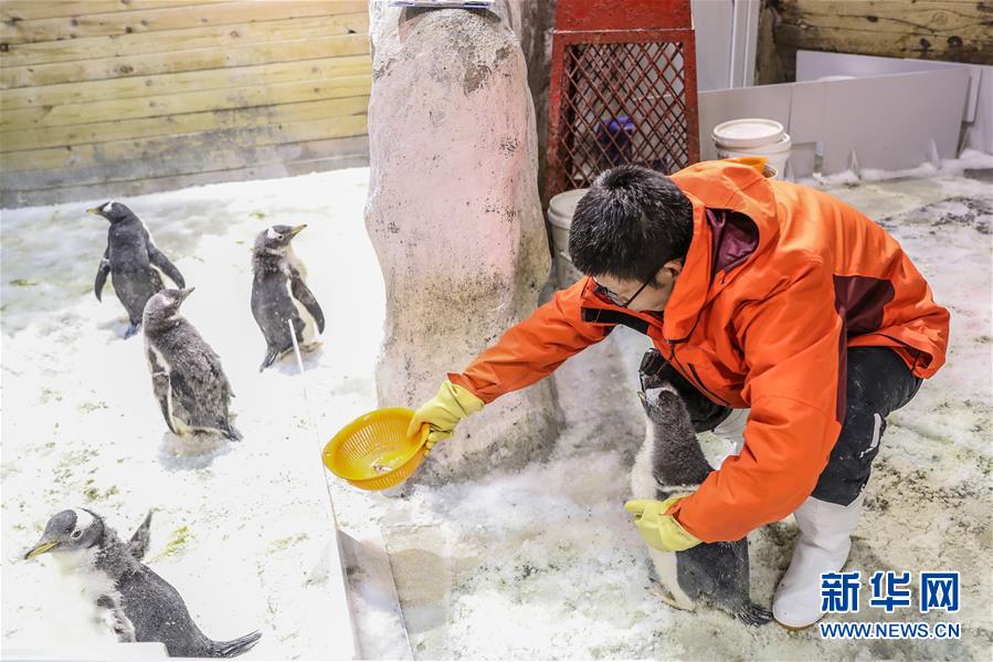 1月9日,驯养员给白眉企鹅宝宝喂食。 新华社记者 潘昱龙 摄