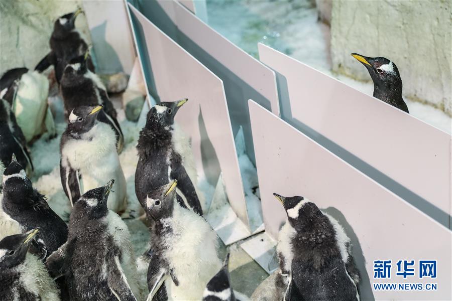 1月9日,成年白眉企鹅(右)在隔离板外关注自己的宝宝。 新华社记者 潘昱龙 摄