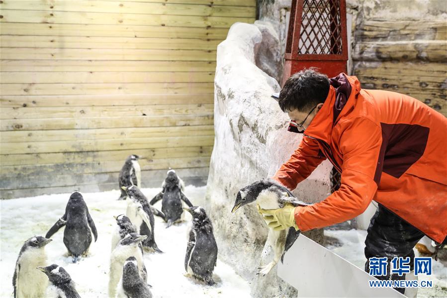 1月9日,驯养员准备给白眉企鹅宝宝喂食。 新华社记者 潘昱龙 摄